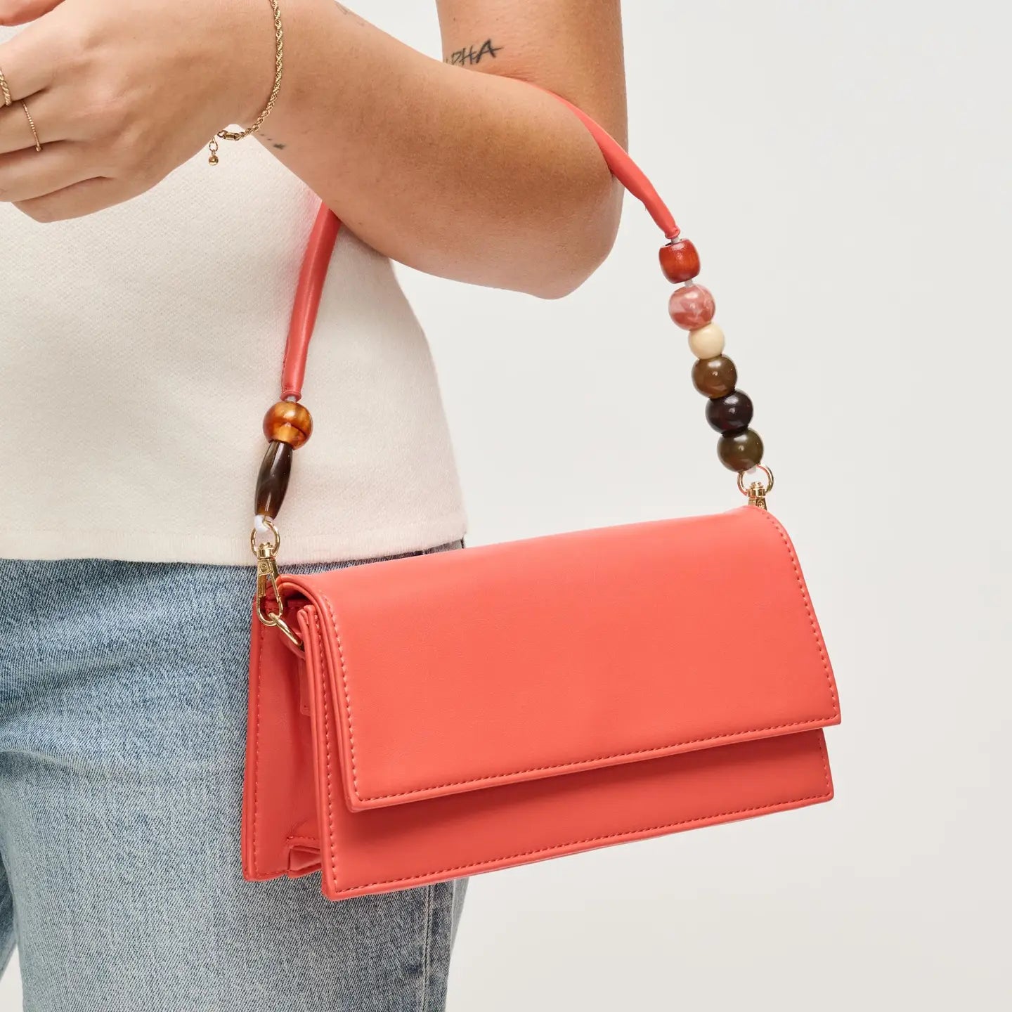 Sleek, structured flap silhouette with a sculpted top handle accented by mixed beads and gold-tone hardware. Slim yet roomy enough for phone, cards and keys, wears as a shoulder or short-handle piece. Ethically minded materials, contemporary lines, perfect for day-to-night looks and trend-aware wardrobes seeking a polished, memorable finishing touch.