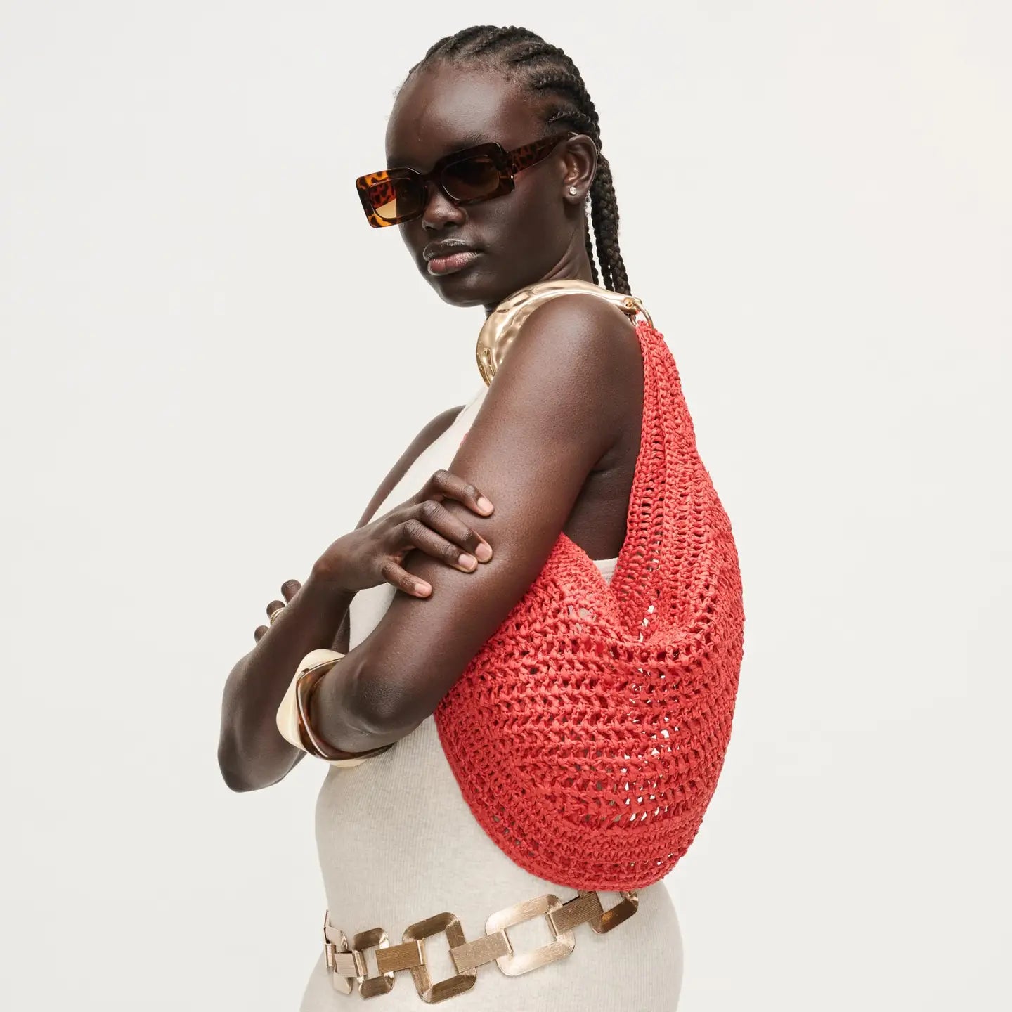 Slouchy, roomy interior holds daily essentials, while the breathable weave keeps the silhouette light and elegant. Curved, cushioned handle and subtle hardware deliver comfortable, modern polish. Ideal for trend-aware, ethically minded wardrobes that favor versatile day-to-night pieces. Wear by hand or tuck under the arm for effortless shape.