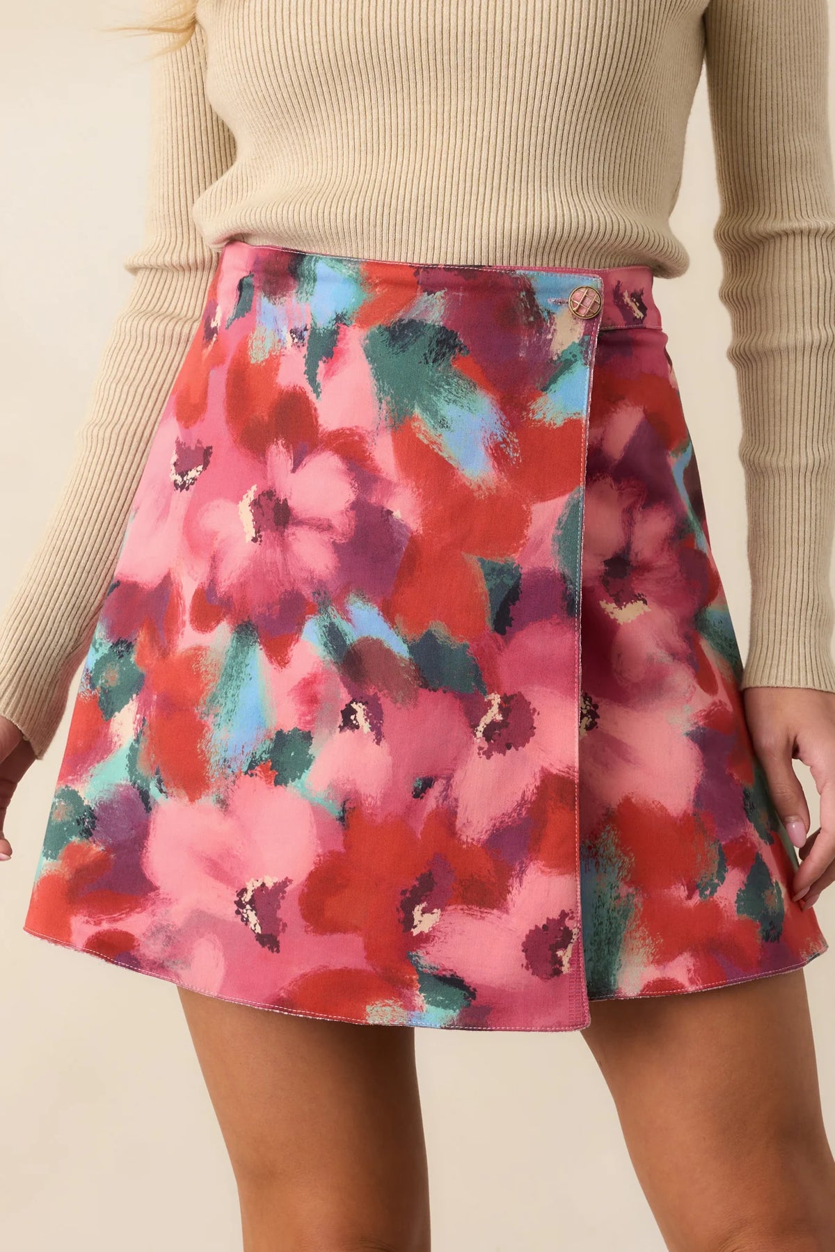 The Prosperina Carrington Pink Multi Floral Velvet Reversible Mini Skirt brings refined versatility, a polished piece with rich texture and feminine appeal. This reversible mini skirt features a pink multicolor abstract floral print on one side and a solid pink velvet finish on the other, designed with a flattering wrap silhouette, and a secure button closure at the waistband.
