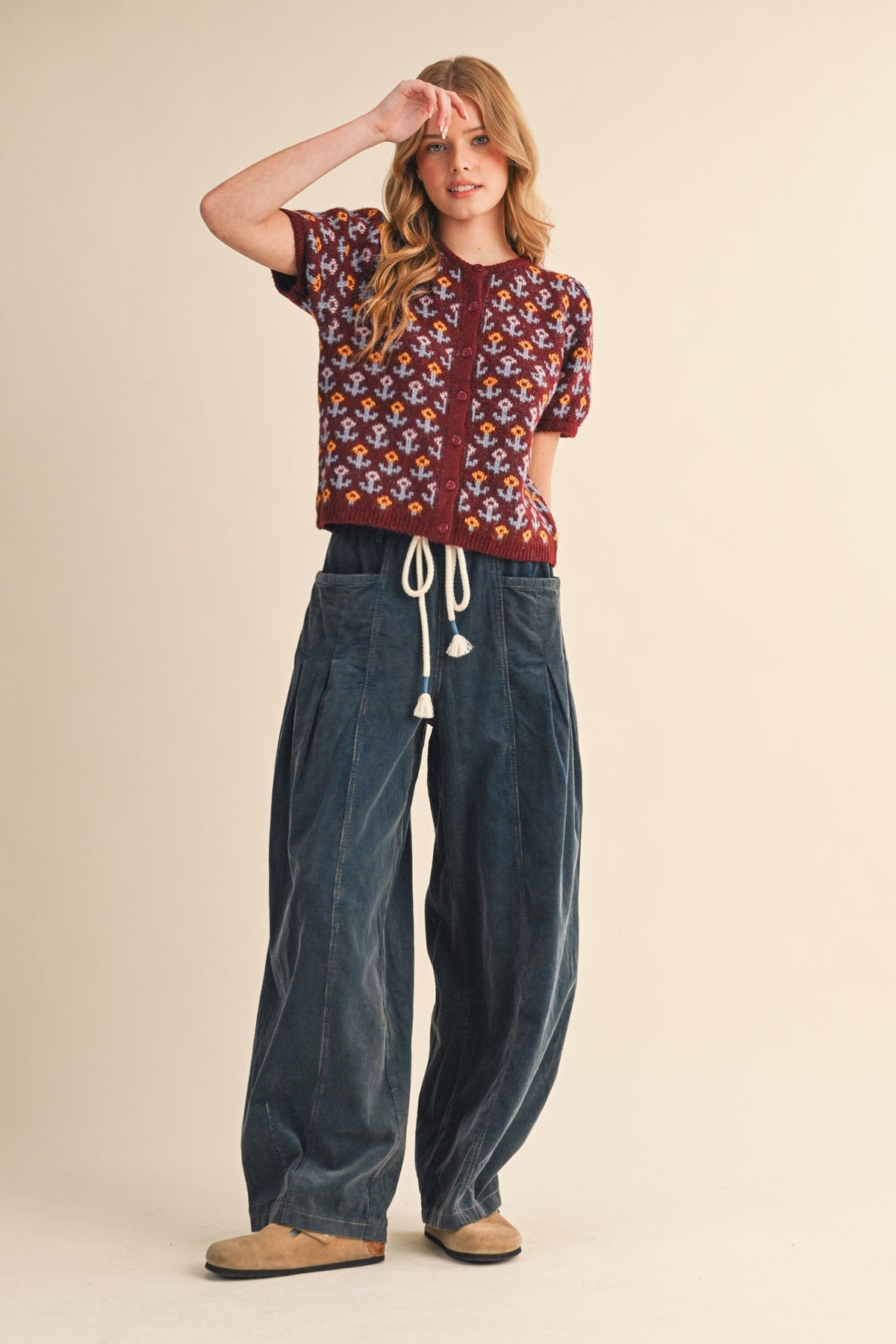 + Floral knit short puff sleeve sweater cardigan