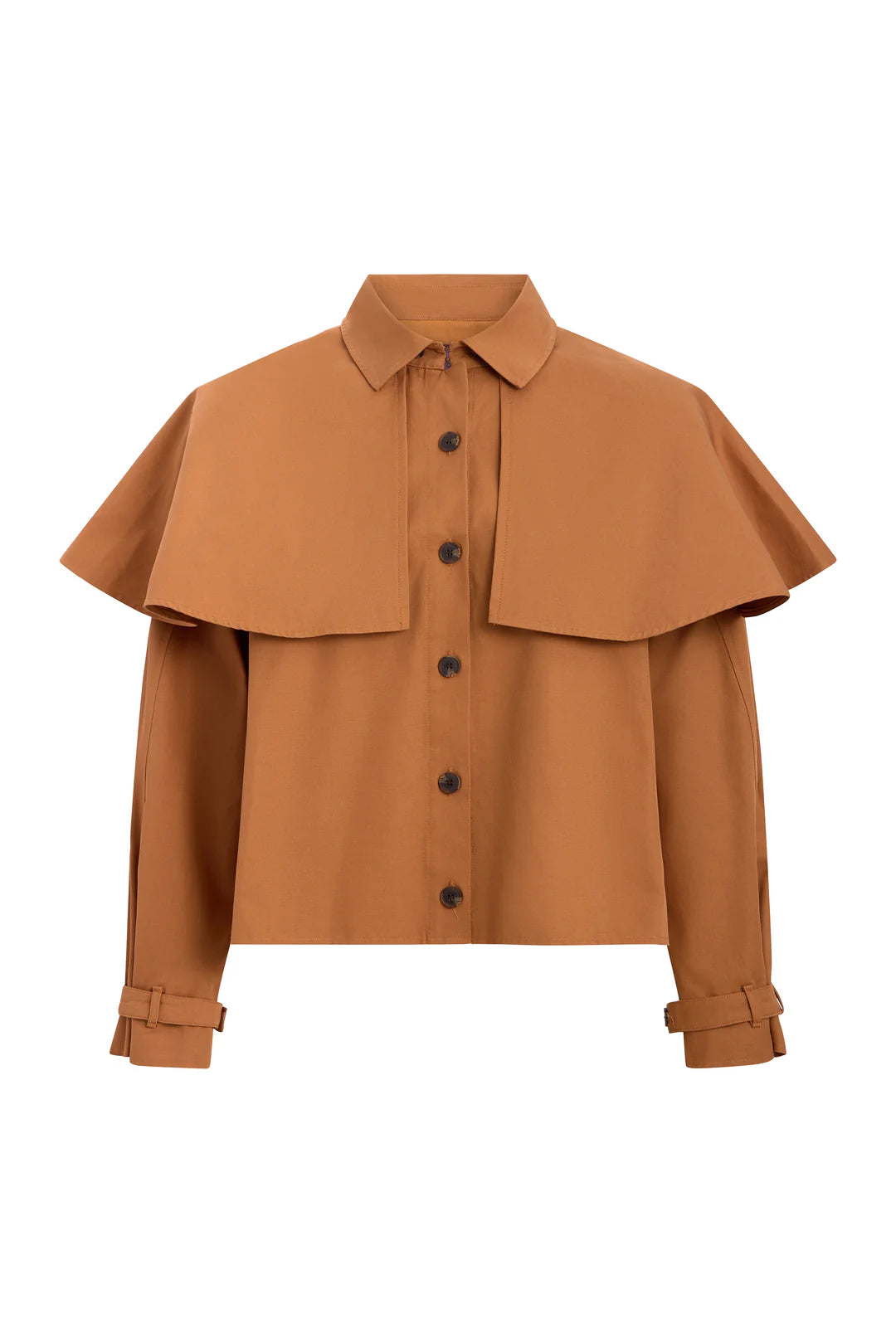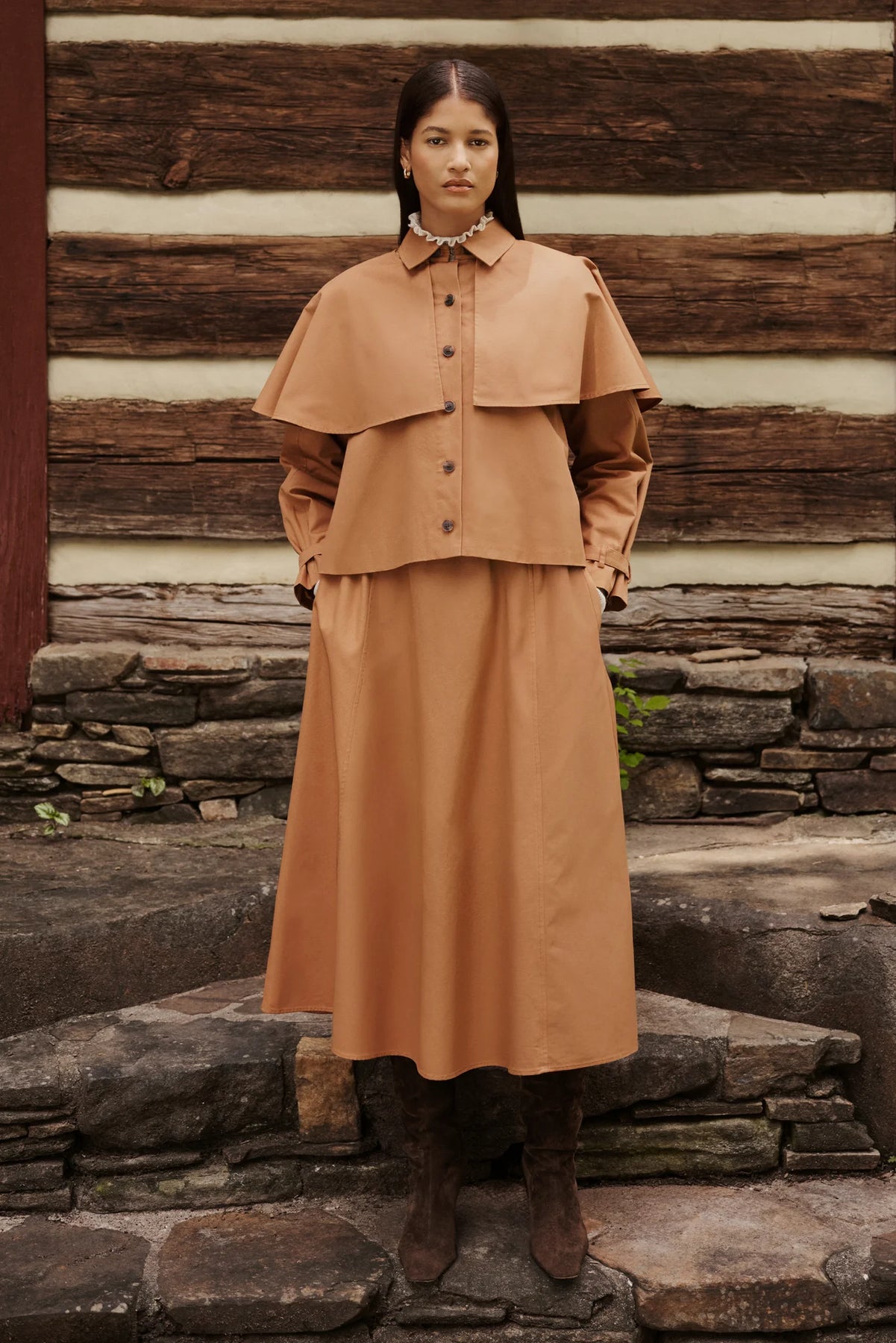 A contemporary cut meets a timeless classic with the Etheridge trench, protecting you against inclement weather and the tedium of transitional dressing. The Etheridge evokes dramatic flair with a removable cape and sturdy cotton construction that could have drifted straight out of a gothic romance novel. Make it a matching set with the Sasha skirt in Argan for a tonal autumnal look that can also withstand the elements.