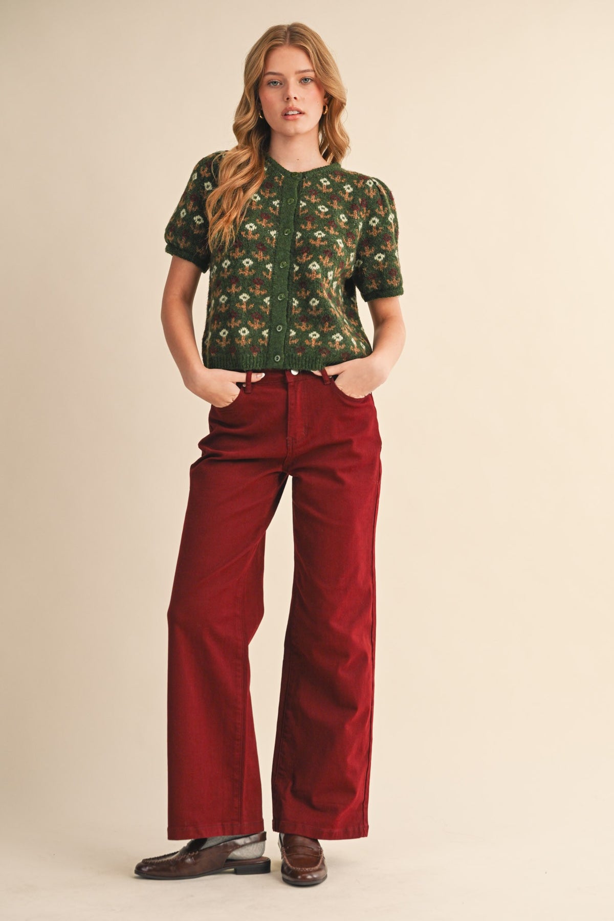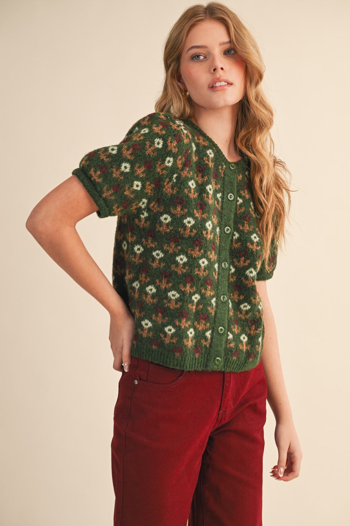 + Floral knit short puff sleeve sweater cardigan