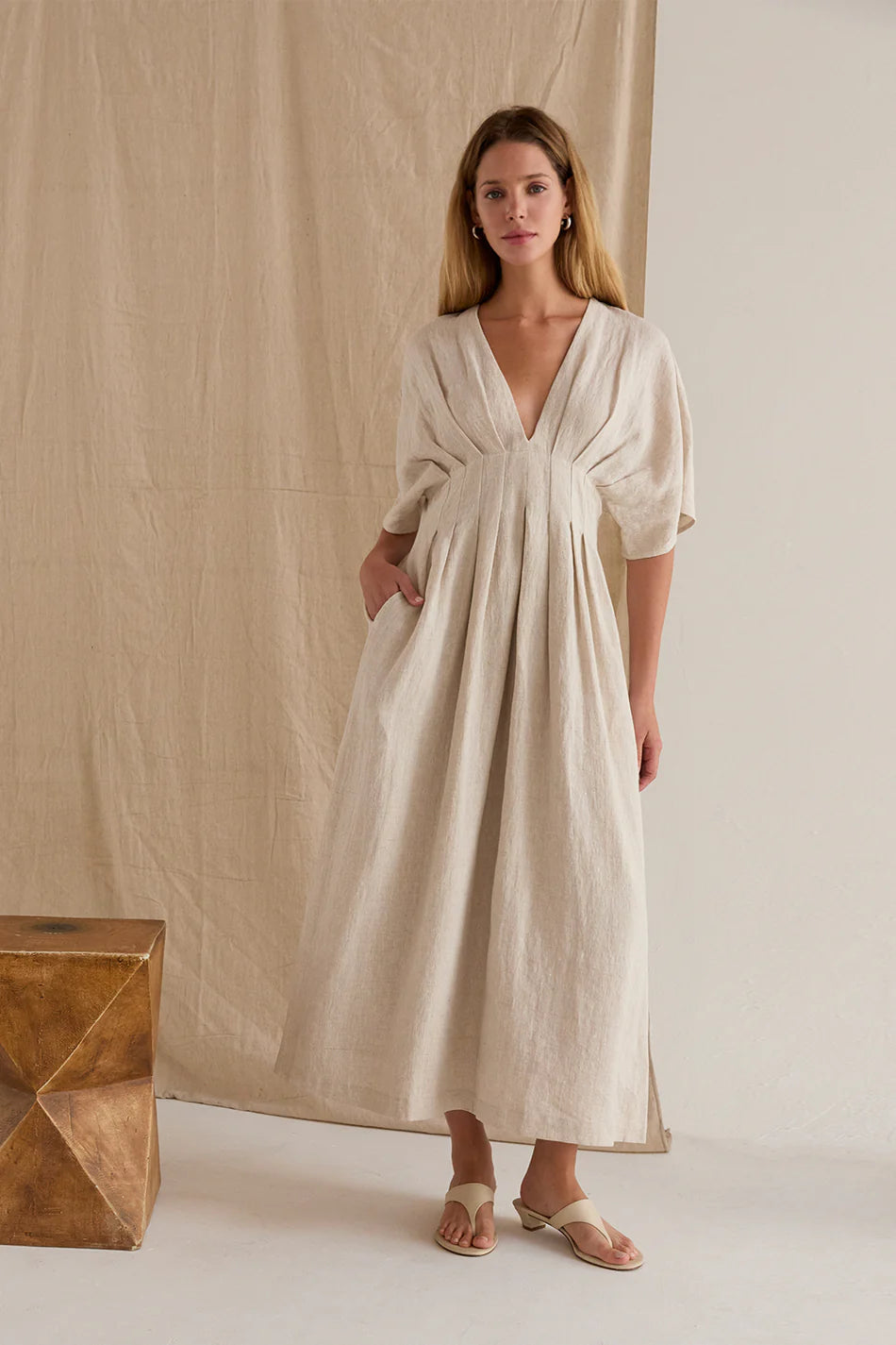 The Amiee Pleated Linen Midi Dress features a deep V neckline with soft dolman sleeves and pintuck detailing that defines the waist. Designed with a V-back tie and flowing midi skirt, it’s finished with hidden pockets and partial lining for an effortless, elevated feel.