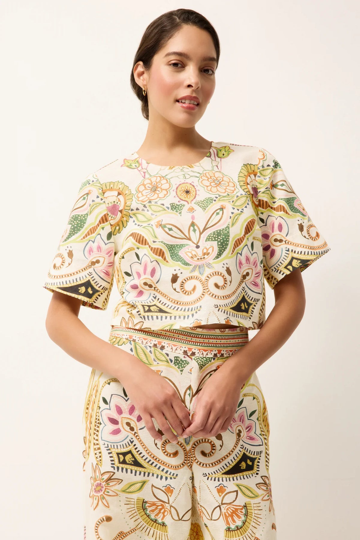 Made for the crop-top devotee, this linen-cotton silhouette pairs a clean, tailored cut with a buttoned back and an artful floral placement print. It captures the ease of vacation on the Mediterranean and looks especially chic with the coordinating high rise, wide-leg Bennett pant in Haven.